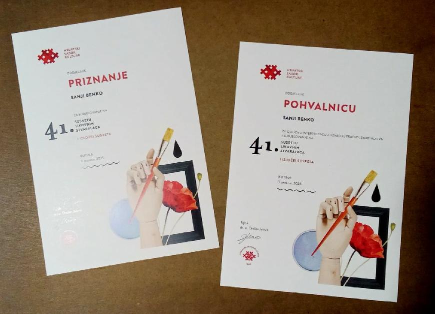 Članica Udruge „Osebunjek“ Sanja Benko sudjelovala je na "41. susretu likovnih stvaraoca" u organizaciji Hrvatskog Sabora Kulture u Kutini, 2025. Nagrađena je Pohvalnicom za odličnu interpretaciju i izvedbu tradicijskog motiva. To nije njena prva nagrada na „Susretma likovnih stvaraoca HSK. Više puta je pohvaljivana ili nagrađivana, a njene dvije slike su odabrane za naslovnice Zbornika radova sa „Susreta hrvatskih zavičajnih književnika Hrvatskog sabora kulture“.