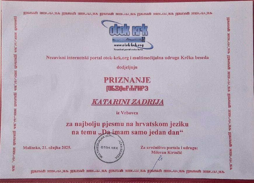 Već tradicionalno, po trinaesti put, dana 21. ožujka 2025. u DUBoak - Maritime Heritage Interpretation Centre u Malinskoj, održan pjesnički susret pod nazivom "Utoplimo Krčku zimu". Organizator susreta je Nezavisni internetski portal otok-Krk.org i Multimedijalna udruga "Krčka beseda". Natječaj se provodi u dvije kategorije. Na Hrvatskom i Čakavskom jeziku. Susret se svake godine održava 21. ožujka, na dan pjesnika. Ove je godine između ostalih na natječaju sudjelovala vrbovečka pjesnikinja i predsjednica Udruge "Osebunjek" Katarina Zadrija. Nagrađena je prvom nagradom za pjesmu na Hrvatskom jeziku. Nagradu je podijelilo troje autora. Dobitnici druge dvije prve nagrade su Dragica Reinholz iz Zlatara i Ivica Brusić Bruje iz Brusići.Dobitnici nagrada na čakavskom jeziku su: Marin Turčić iz Čizići, Vesna Milan iz Rovinja i Maja Jugović Mohorić iz Krka.